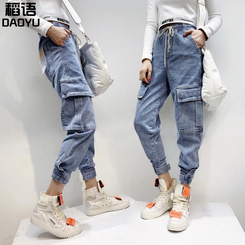 浅蓝色松紧腰牛仔裤女宽松韩版束脚工装裤哈伦老爹休闲垮裤春新款热门设计联盟服务商