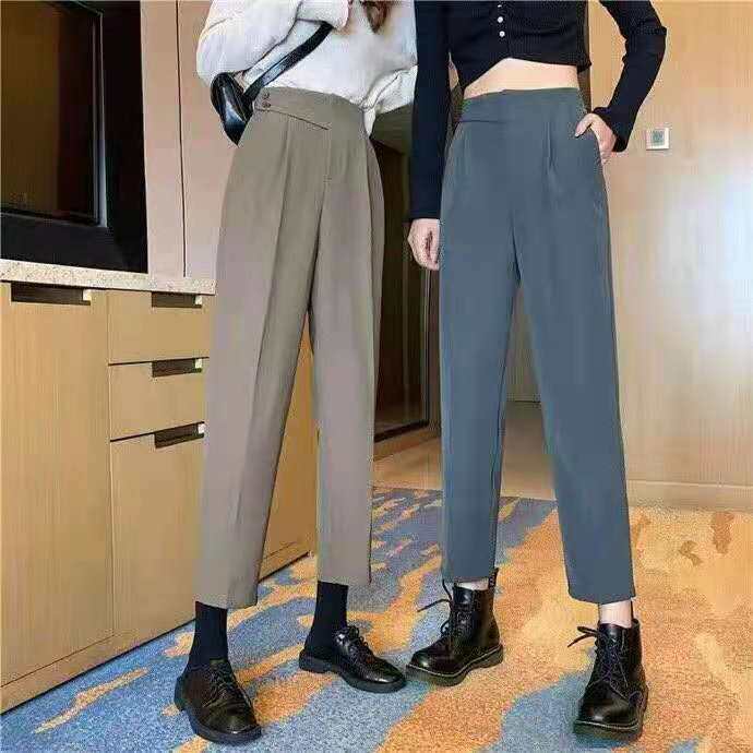 高腰半松紧带设计系扣西裤小脚裤微九分裤纯色百搭有型显瘦热门设计联盟服务商
